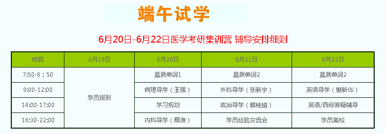 端午节和考试周即将到来,验证一个学期学习成果的时间到了。学霸、学酥、学渣,你现在处于哪个阶段?研大考研2016西综考研中期大练兵,你准备好了吗? 半年时间,你拿什么迎战考研? 平时的听课练题,自习室的背诵记忆,考试前的通宵达旦,平日的学习多为应付考试。现在的你可能会想着先把期末过了就好,反正考研还有半年/1年半时间,到时再开始针对性的复习。但是,考研的考察目标、出题方式和学校的大相径庭。2016考研仅剩半年复习时间,你的脑细胞现在全部就位了吗? 3天4夜端午集训 找准目标再前进 针对半年期阶段性学习效果检测,研大医学考研集训营为同学们安排了为期3天的端午试学活动,全方位检测同学们的考研复习成果,指导暑期阶段性复习方向。届时,北医名师将为到场学员1对1规划复习方案,专业答疑老师为学员梳理知识架构,系统性复习提高学员综合能力。